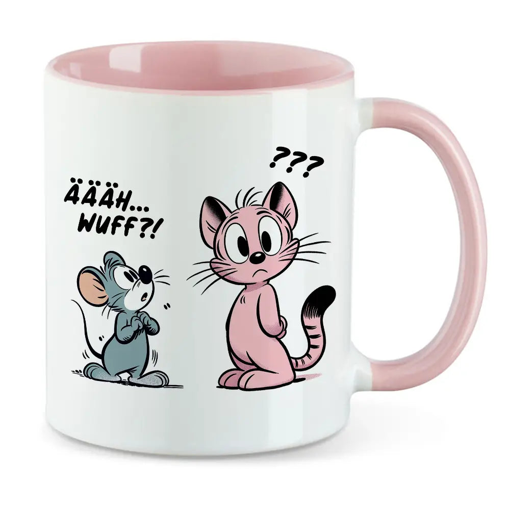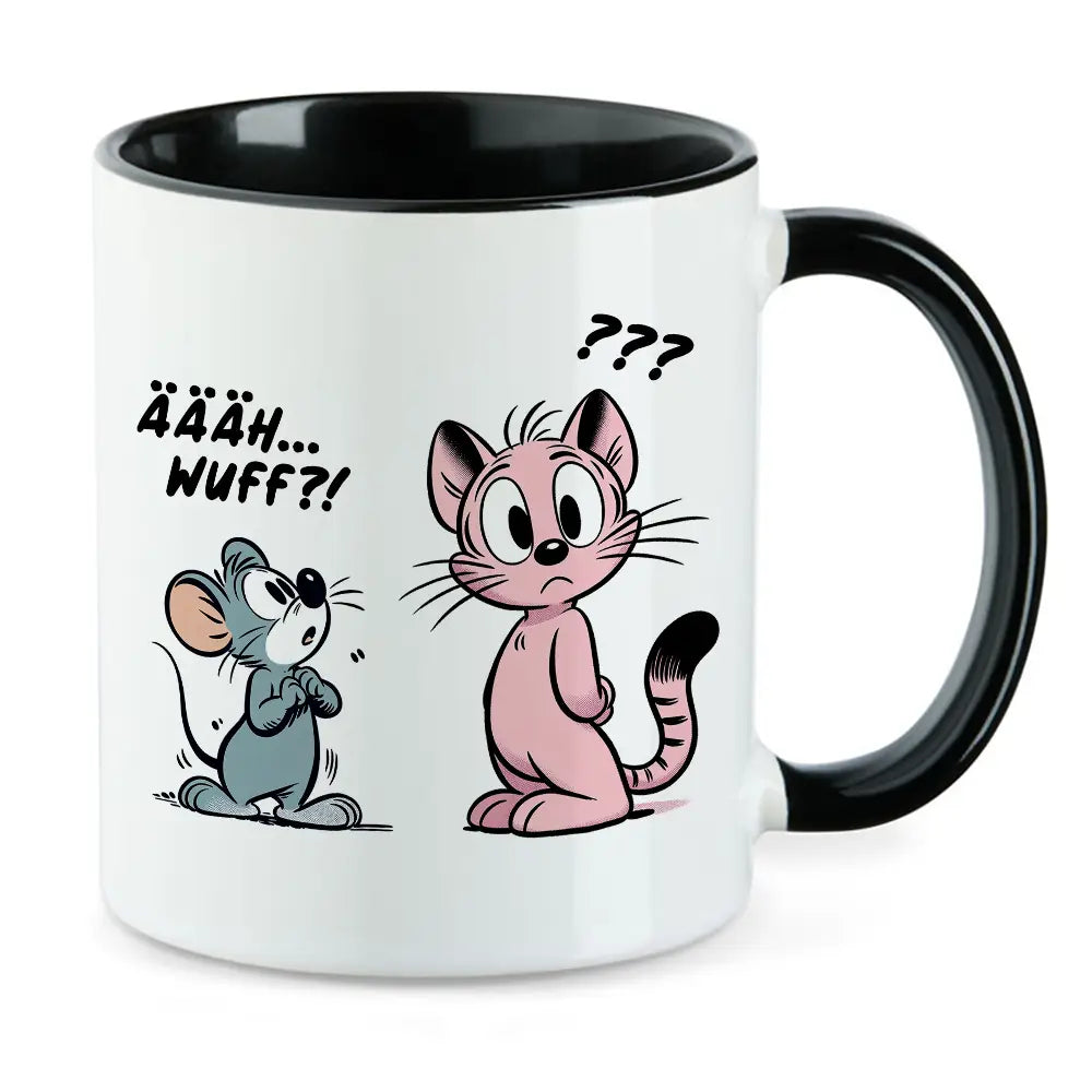 Wenn du morgens noch nicht weißt, ob du Katze oder Maus bist – dann ist diese Tasse dein spirituelles Gefäß! Mit dem skurrilen Spruch „Ääääh… Wuff?!“ und der niedlich verdutzten Comic-Katze samt verwirrter Maus ist sie das perfekte Geschenk für alle, die mit einem kleinen Verwirrungszustand in den Tag starten. Ob als Gag im Büro, als kleine Aufheiterung zuhause oder als Geschenk für Katzenliebhaber:innen: Diese Tasse sorgt garantiert für Gesprächsstoff (auch wenn niemand so genau weiß, worum’s eigentlich geht 🤷♂️).